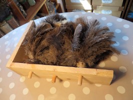 Auch ..... ich habe den mutterlosen Küken eine Straußenfeder-Küken-Hudder-Vorrichtung unter die Wärmeplatte gebaut die aus Straußenfeder-Staubwedeln besteht. Die frisch geschlüpften Knirpse finden die offenbar ziemlich klasse und haben sie sofort angenommen. Das freut mich sehr. Ohne Mutter aufwachsen ist echt blöd. Da möchte ich das Kükenheim so optimal gestalten wie es halt eben geht.
