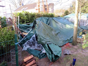 Es gibt verschiedene Möglichkeiten Hühner bei Stallpflicht unter zu bringen. Partyzelte oder Gewächshäuser aus Kunststoff wären eine Möglichkeit. Wir haben uns als erstes ein grünes Partyzelt von 3 x 6 m Ausmaßen für etwa 70,00 Euro gekauft. Das erwies sich aber leider als nicht wirklich wetterfest. Bei stärkerem Regen beulte sich das Dach ein so dass sich das Wasser sammelte und die relativ dünnen Rohre welche die Konstruktions tragen sollten unter der Last wegknickten. Darum stabilisierte ich das Zelt von innen mit zahlreichen Stützbalken und Teleskopstützen. Aber nach einem Orkantief war das Zelt dann endgültig nicht mehr zu erkennen.