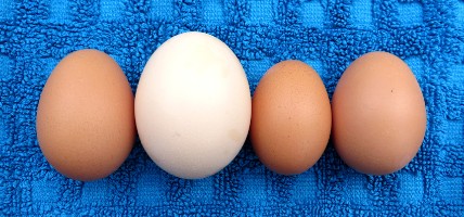Das Ei auf der rechten Seite ist das erste Ei von Nyssi. Sie hat es am 02. Oktober 2016 gelegt. Und dafür dass Nyssi ein französisches Masthuhn ist ist das Ei doch recht stattlich ..... wenn man bedenkt dass Eier legen eigentlich gar nicht ihre Aufgabe ist :) Wahrscheinlich werden ihr Eier im Laufe der Zeit auch noch ein wenig größer. Das Ei links daneben ist wie immer ein normal großes Zwerghuhn-Ei.