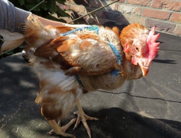 Und Helga hat deutlich größere Probleme sich an ihren Wärmeschutz zu gewöhnen. Sie hat gut zwei Stunden gebraucht bis sie das Teil nicht mehr als störenden Fremdkörper empfunden hat. Zu Beginn ist sie fast nur rückwärts gelaufen und ist regelrecht getorkelt. Ich habe sie eine ganze Zeit lang im Gehege geschoben und gestützt bis sie sich zurecht fand.